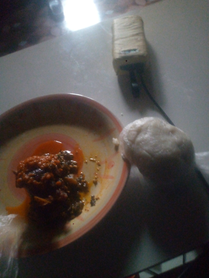 This image captures an indoor scene in the city of Unknown, Unknown, displaying a meal arranged on a light-colored surface, likely a table. A round ceramic plate, featuring a red and yellow/orange concentric ring pattern, holds a portion of a stew or sauce. This dish consists of a reddish-orange base with darker, granular components and a sheen of red oil. Adjacent to the plate on its right, a prominent white, smooth, rounded mass of starchy food, consistent with a "swallow" food type, rests partially on a clear plastic film, which is also visible beneath the plate to the lower left. In the upper right background, an off-white, rectangular electronic power adapter or charger is positioned, with a dark power cable extending downwards from its base. A bright, overhead light source causes a significant glare in the upper central portion of the image and on the table surface, illuminating the scene unevenly and creating shadows. No individuals, explicit actions, or interactions are visible.