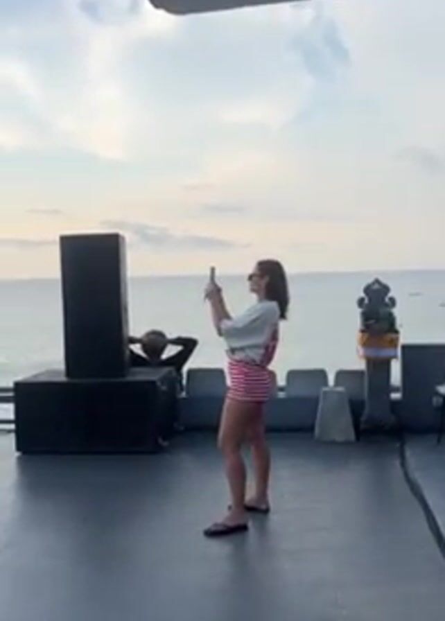 woman taking pictures with a phone on a rooftop terrace, overlooking the ocean. She is wearing a t-shirt and red and white striped shorts. Nearby, a DJ is playing music from a sound system. He is wearing a patterned shirt and cap. The terrace has a black tiled floor and a simple black railing overlooking the water. The sky is overcast.