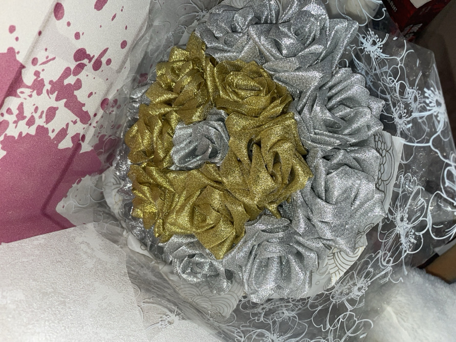 An indoor close-up photograph displays a decorative bouquet. The primary subject is a bouquet composed of artificial fabric roses, prominently featuring a central cluster of approximately five gold-colored, shimmering roses surrounded by numerous silver-colored, shimmering roses. The bouquet is encased in a transparent, glossy wrapping adorned with white outlines of flowers or foliage, overlaying a lighter, possibly patterned, material. The immediate background on the left reveals a textured white surface, while the right displays a wall with a magenta splatter pattern against a white background. A soft, white, textile-like object is partially visible in the lower-left corner, and a dark, rectangular object with red lettering is partially visible in the lower-right corner. No individuals or actions are depicted. The specific location within the city of Ново-Никольское, Russia, is not discernible from the provided visual information.