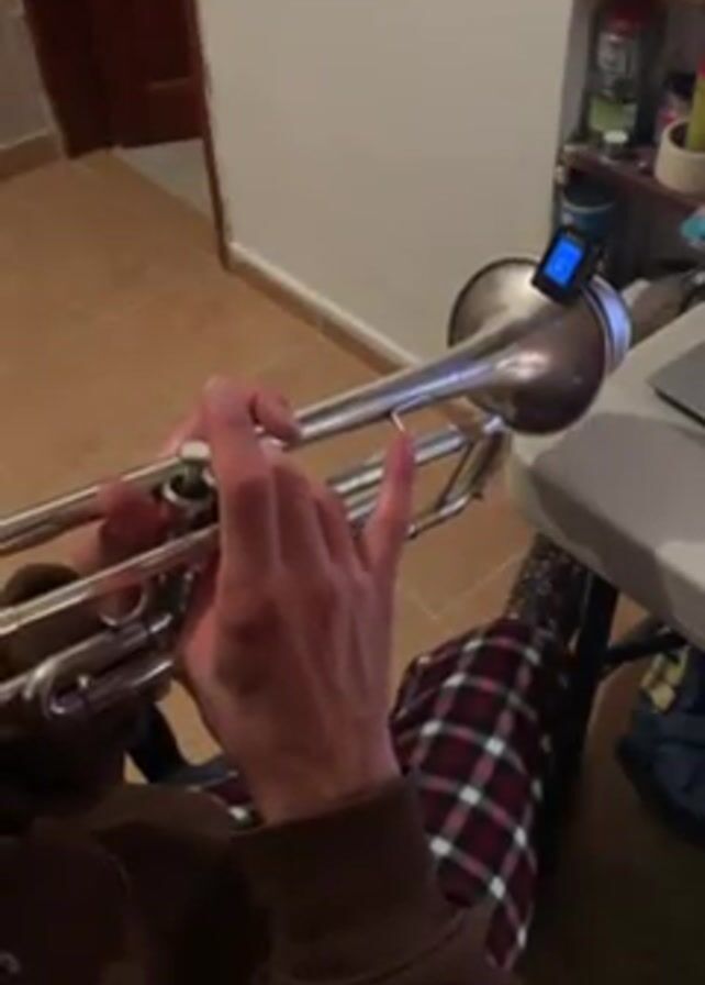 A person wearing brown clothing and plaid pants is sitting and playing a silver-colored trumpet. A small blue electronic tuner is attached to the bell of the trumpet. The person's fingers depress the valves of the trumpet. The person is indoors on light brown tile. There is a white table to the person's right, with a laptop on the table. Behind the table is a shelving unit. There is an open door in the background.