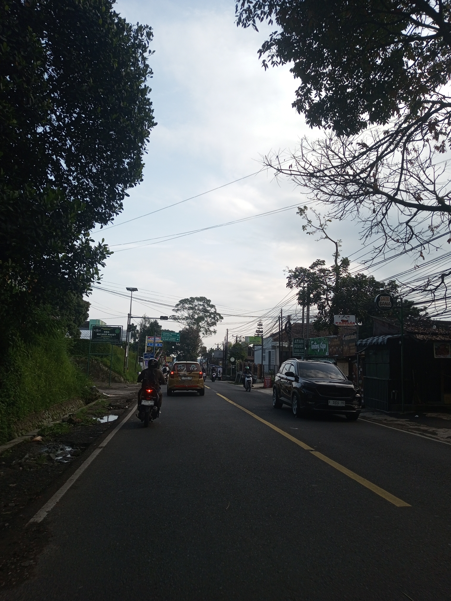 The image depicts a road scene with vehicles and signage. **Location:** The text on the sign partially reads "SMA MA'ARIF PACET", and "D'BARBAR". Additionally, there is a yellow car in the center, and black car. **Environment:** A paved road with a solid yellow line running along its length is visible. Trees are present on either side of the road, partially obscuring the sky. **Objects:** * Vehicles: A yellow car, and a black car. * Motorcycle: A person riding a motorcycle. * Signage: A traffic sign is present on the left side of the road, alongside a sign reading "SMA MA'ARIF PACET". A restaurant sign with the letters "D'BARBAR" can be seen in the background, as well as a sign saying "Tentang Kopi". **Actions:** * Vehicles and a motorcycle driving on the road. **People:** * A person riding a motorcycle.