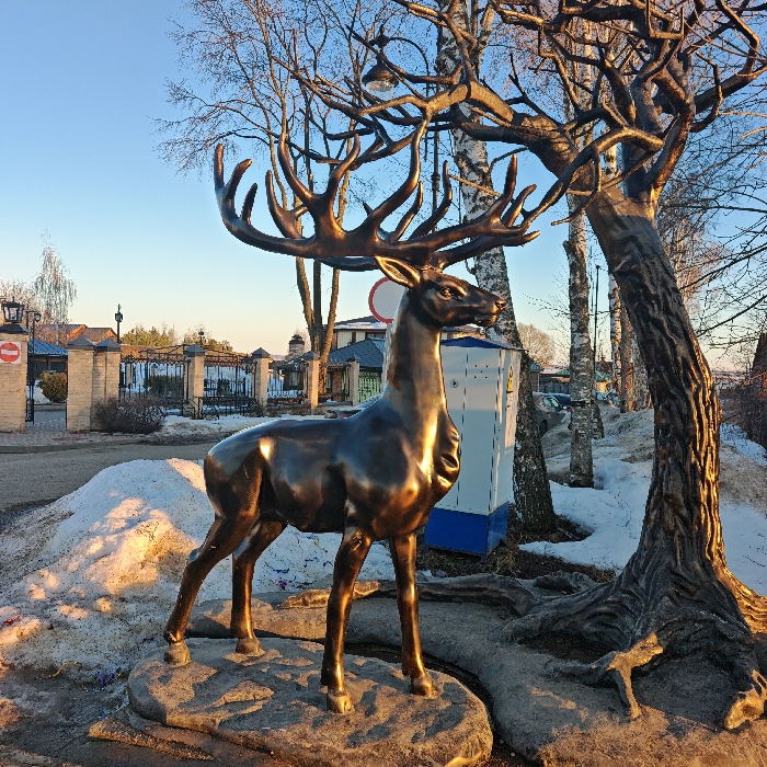- "The image displays a bronze statue of a male deer (stag) with a full rack of antlers, standing prominently on a textured, rock-like base in an outdoor setting in Rostov Veliky, Russia" by FM-cLarj2, licensed under CC BY 4.0