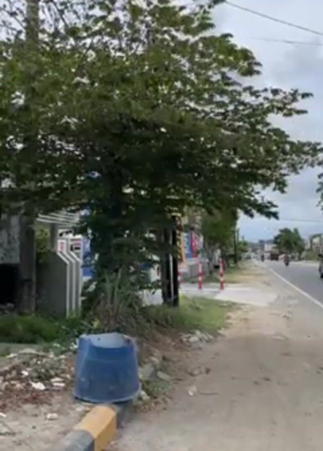 street scene in what appears to be a semi-rural area. The camera is positioned on a dirt shoulder next to a road. A tree with green leaves stands between the camera and the road, partially obscuring the view. A blue trash receptacle is visible in the foreground. The road has moderate traffic, with motorcycles and cars passing by. The sky is overcast with grey clouds. There are utility poles along the side of the road. Buildings and signage are visible in the background.