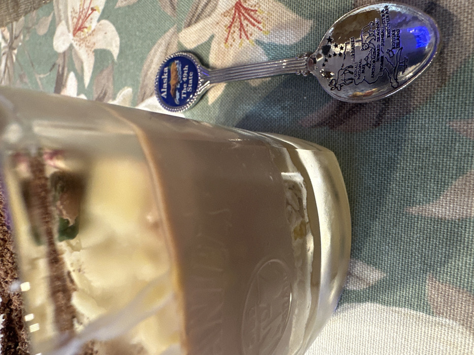 The scene is an overhead close-up of a tabletop surface in Voluyak, Bulgaria. On the left, a clear glass contains a layered dessert or beverage. The lowest visible layer is a light brown opaque liquid, topped by a thicker, creamy white or pale yellow substance. The uppermost layer consists of dark brown crumbs, likely chocolate, with small, indistinct green and pink inclusions. A thin, white, stick-like object is partially visible within the upper portion of the glass's contents. Faint, embossed text or a design is visible on the lower side of the glass. To the right of the glass, a silver-colored souvenir spoon rests flat on the surface. The spoon features a circular finial with a blue enamel background, displaying the text "Alaska The 49th State" and a gold-colored bear silhouette. The spoon's bowl is decorated with an engraved map of Alaska, labeling cities such as Denali, Fairbanks, Anchorage, Seward, Sitka, Ketchikan, Kodiak Island, Homer, and Juneau, along with illustrations of a moose, another animal (possibly a bear or wolf), and scattered stars. The items are positioned on a light green fabric tablecloth or placemat featuring a repeating floral pattern of white blossoms with red and orange accents, and green leaves. No individuals are visible.