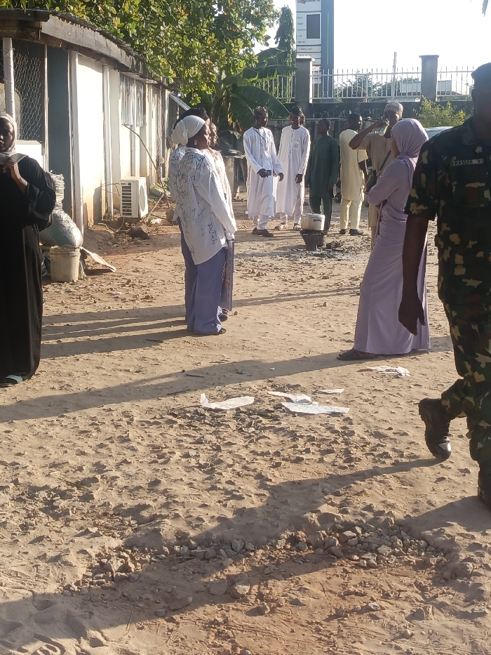 The image depicts an outdoor scene on an unpaved, light brown dirt and gravel path in Lafia, Nigeria, under clear daylight conditions with prominent shadows suggesting morning or late afternoon. Approximately ten individuals are present. On the left, a person in a black abaya is partially visible, facing right, standing near two white plastic buckets. To their right, a woman wearing a white patterned tunic, blue trousers, and a white head covering stands, facing right. Behind her is a single-story white building with two white outdoor air conditioning units mounted on its wall. Further right, a group of approximately five to seven men are standing. Most wear white traditional garments and caps, while one wears a dark green long-sleeved garment. They appear to be engaged in conversation. In front of this group, a cooking pot rests on a low metal stand on the ground, with evidence of charring beneath it. To the right of the men, a woman in a light purple long-sleeved dress and head covering stands with her arms crossed, facing towards the male group. On the far right foreground, a person in military camouflage fatigues, bearing the name "HASSAN Y" on their uniform, is partially visible from the waist down, walking towards the right side of the frame. The ground surface is uneven, consisting of loose dirt, small rocks, and scattered pieces of white paper or plastic litter. In the background, green foliage from trees and shrubs is visible, along with a gray building featuring a sign or billboard and a metal fence.