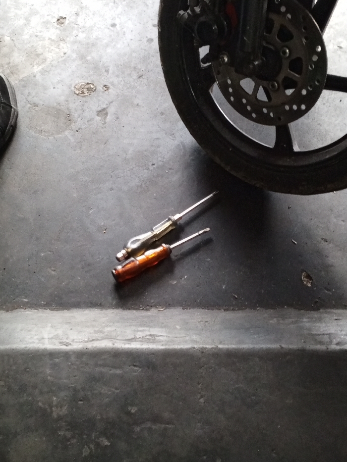 The image captures a ground-level scene in Chennai, India, featuring elements suggestive of vehicle maintenance. A partial view of a motorcycle's front wheel is visible in the upper right, displaying a black tire, a dark five-spoke rim, and a silver-colored disc brake rotor with numerous ventilation holes. The motorcycle's dark front fork and a portion of the brake caliper are also discernible. On the dark grey concrete ground, two screwdrivers are positioned. One, appearing larger, has a clear, translucent handle with a metallic shaft and tip, and a prominent hexagonal nut near the handle. The second, smaller screwdriver features a translucent reddish-brown handle with a metallic shaft and tip. The toe of a dark-colored shoe is partially visible in the upper left corner. The concrete ground surface exhibits uneven coloring, light scuff marks, and minor debris. A horizontal concrete step or raised edge runs across the lower portion of the frame.