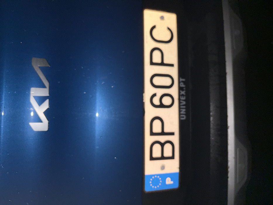 A close-up, low-light image captures the rear of a blue Kia vehicle in Mirandela, Portugal