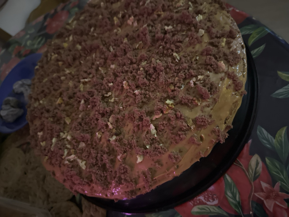 A close-up shows a round cake on a black plate atop a floral-patterned tablecloth. The cake is covered with a layer of glossy, caramel-colored frosting. A generous topping of crumbled red velvet cake and scattered walnut pieces adorns the surface. A small blue plate with dark gray rocks is to the side, and a neutral-colored object is blurry in the bottom left.