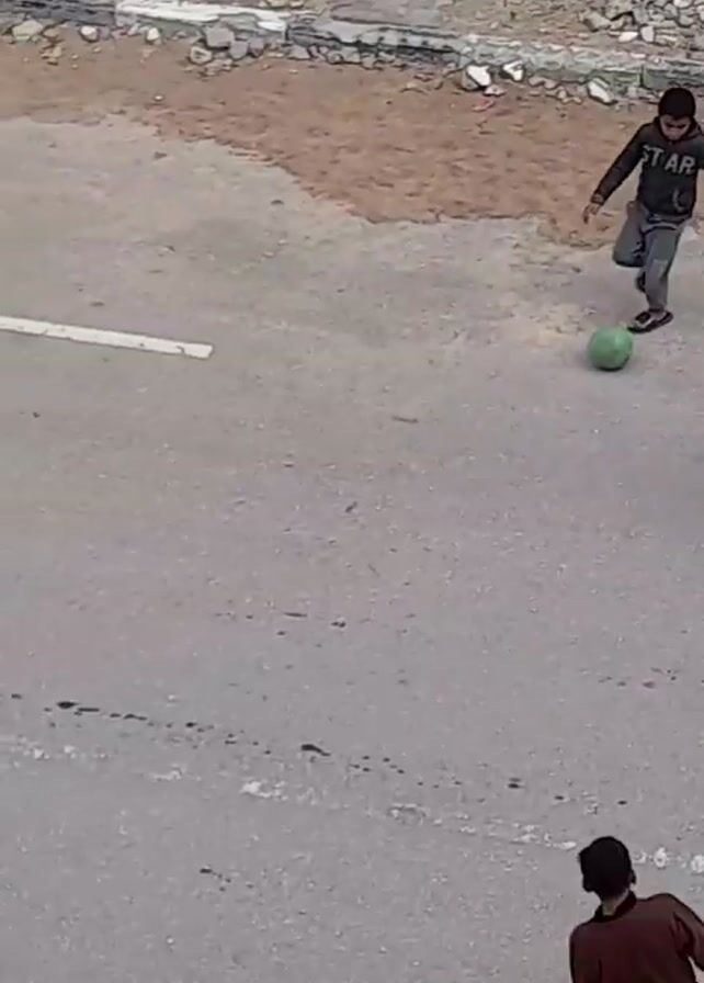 Two young boys are playing with a green ball on a paved surface with a white line marking. The boy closest to the camera wears a dark jacket, grey pants and dark footwear. The other boy wears a blue jacket, light-colored pants and light footwear. Both boys are focused on the ball. A small section of dirt and scattered stones borders the pavement. Two figures appear in the lower foreground. The setting appears to be an outdoor, urban environment.