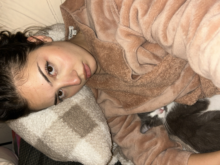A woman with dark hair and brown eyes rests on a patterned pillow, her face angled towards the camera. She is wrapped in a plush, rose-colored hooded garment. A grey and white kitten is nestled beneath the fabric, its face peeking out. The scene is intimate and warm, conveying a sense of relaxation and comfort. The lighting is soft and diffused.