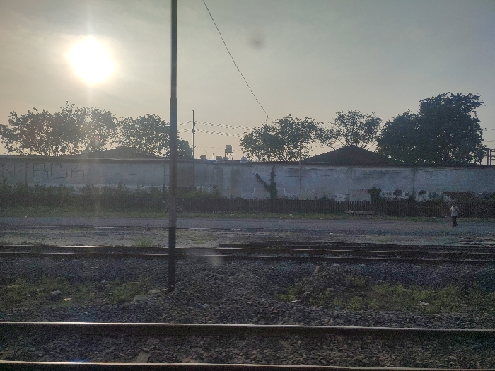 view of a train track in Kecamatan Waru, Indonesia, with a concrete wall and trees in the background. The sun is shining brightly in the sky, and the ground is covered in gravel. A person can be seen walking on the ground near the wall, which is painted white and has some graffiti on it. There are several sets of train tracks in the foreground. The scene appears to be taken in the early morning, with a clear sky and a bright sun. The image was likely taken from a train. The environment is serene and quiet, with no other people or vehicles visible.