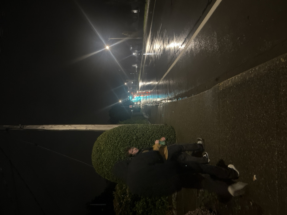 The image displays an outdoor nighttime scene in Saanich, Canada, under wet conditions, suggesting recent or ongoing rain. Two individuals are positioned on a grey concrete sidewalk adjacent to a wet asphalt road. Subject 1, in the left foreground, is partially visible from the mid-thigh down, wearing dark pants and light-colored sneakers, appearing to be in motion towards the right. The upper body is obscured by dark clothing or shadow. Subject 2 stands to the right of Subject 1, facing slightly towards the camera. This individual wears a yellow/tan jacket over dark pants and dark sneakers with white soles. A green bottle is held in their left hand. This subject appears to be a young male with brown hair. Along the left side of the sidewalk, a dense, manicured green hedge forms a barrier. Behind the hedge, a wooden utility pole with wires is visible. The wet asphalt road, marked with a solid white line, reflects multiple streetlights and distant traffic lights displaying green and red hues. A prominent streetlight with a starburst flare is visible on the right side of the road in the mid-distance. Further down the road, a white rectangular sign with a red circle and a diagonal line (prohibitory symbol) is discernible on the right shoulder.
