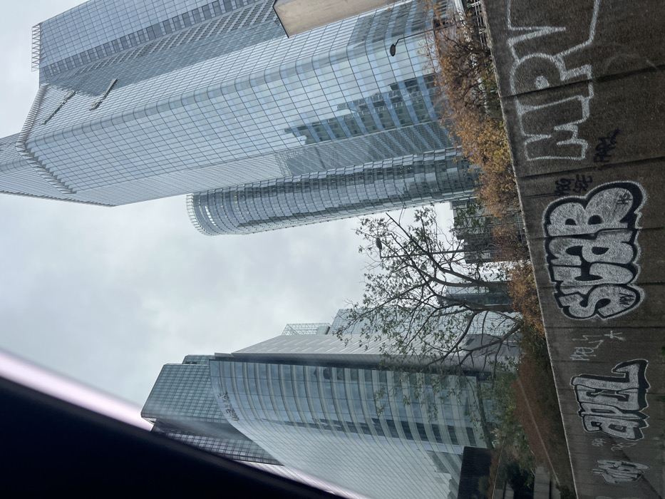 An outdoor scene in the La Défense district of Courbevoie, France, is depicted under an overcast sky. The lower foreground features a concrete retaining wall, heavily covered with white and black graffiti including the clearly legible words "APEL" and "SCAB." Above this wall, a line of deciduous trees with sparse branches and low-lying shrubs displaying autumnal orange and brown foliage are visible. The background is dominated by a cluster of modern skyscrapers. On the left, a large building with a multi-story, curved glass facade is prominent, displaying the "MELIA" logo near its top. To the right of this, a cylindrical glass tower rises among the trees. Further to the right, a significantly taller, angular skyscraper with a reflective glass exterior and a stepped, pointed apex stands against the sky. A dark, opaque structure, consistent with a vehicle's interior frame, partially obscures the upper-left quadrant of the image. No individuals or discernible actions are present.