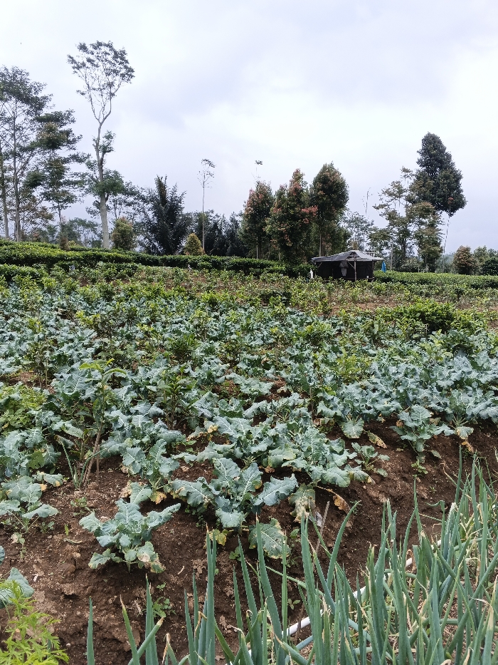 The image depicts an agricultural landscape under an overcast sky, presumably in the city of Unknown, Vietnam. In the foreground, numerous green, upright shoots, consistent with scallions or spring onions, are visible on the right, with a white irrigation pipe partially embedded in the soil. Immediately behind these, a field cultivated with plants featuring large, crinkled green leaves, characteristic of broccoli or cauliflower, extends across the mid-ground. The plants are rooted in dark brown soil. Further into the mid-ground, a dense expanse of smaller, bushy green plants, likely tea, forms a contoured field. Within this upper field, slightly right of center, stands a small, dark, rudimentary shelter or shed with a dark tarp roof. The background is characterized by a line of diverse trees of varying heights and foliage colors, bordering the cultivated areas. No individuals, actions, or direct interactions are present in the scene.