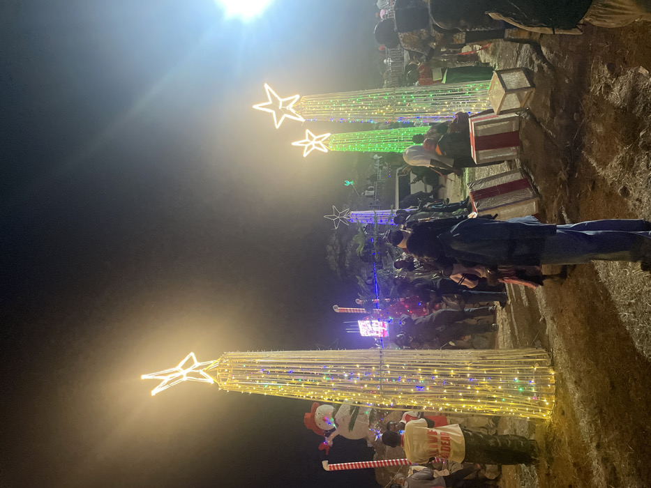 Outdoor scene with people gathered at night among illuminated Christmas decorations. There are tall, slender, light-covered trees topped with star-shaped lights. Wrapped gift boxes with red and white stripes are visible. The scene is illuminated by bright white lights.