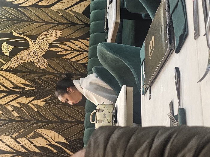 A woman with her hair in a bun sits in a green booth in front of a wall decorated with gold leaves and a crane. She wears a white sweatshirt. On the adjacent white table are cutlery and a menu. A green and white mug sits next to her. The bottom of the frame shows the back of another dark-colored booth.