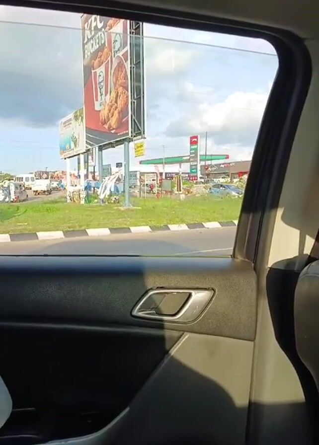 From inside a vehicle, the camera shows the outside world through a car window. The scene includes a KFC billboard advertising buckets of chicken, a PUMA gas station, Pizza Hut and KFC stores, cars, and other signs. The sky is partly cloudy. The car door interior is visible in the foreground. The vehicle is moving.