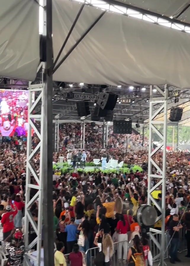 large crowd of people gathered in front of a stage, partially covered by a white tent-like structure supported by metal scaffolding. On the stage, several people are standing or moving around; their identities are not discernible, but they appear to include people dressed in suits, casual clothes, and vibrant colors. The crowd is dense, with many individuals holding up phones, seemingly taking pictures or videos. The scene is brightly lit. Sound speakers are visible at the top of the scaffolding above the stage. A large screen is to the left side of the stage, displaying an image of the crowd, which amplifies the sense of scale.