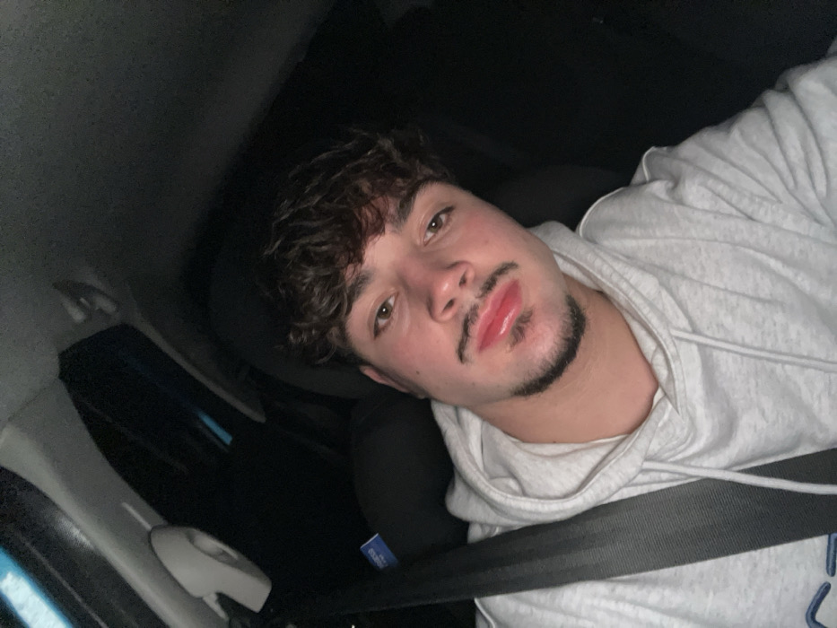 A young man with curly brown hair and a mustache is reclining in what appears to be a car. He's wearing a light gray hooded sweatshirt and a seatbelt is fastened across his chest. The lighting is dim, suggesting it might be nighttime or a dimly lit interior. The man is looking directly at the camera with a relaxed expression. The overall impression is casual and perhaps a bit nonchalant.