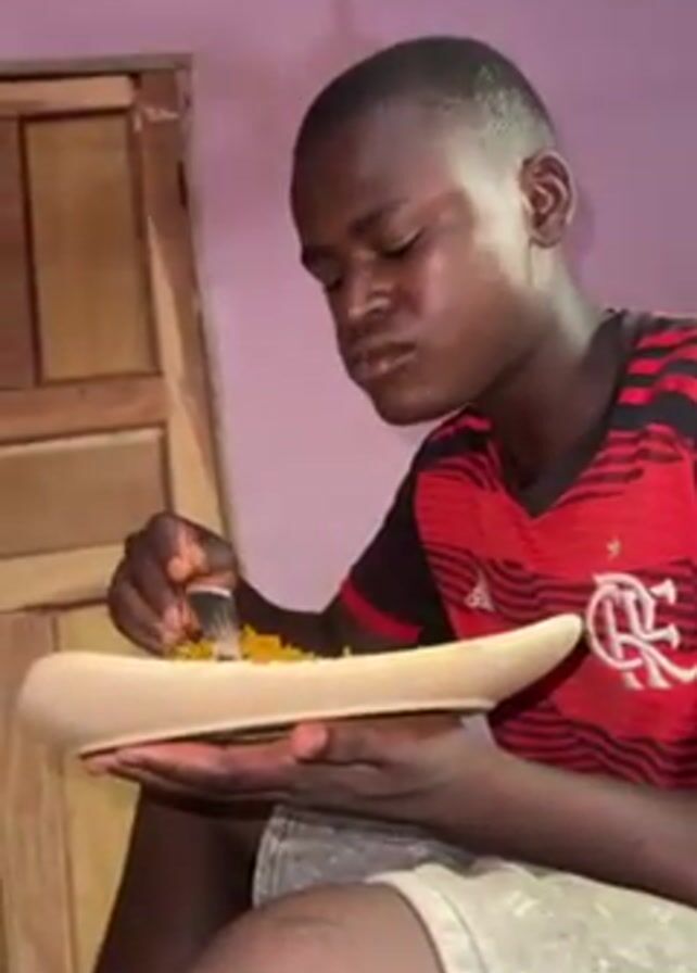 A young man is sitting down, holding a long, shallow dish filled with rice and using a fork to eat. He is wearing a red and black soccer jersey and denim shorts. The background includes a wooden door and a light purple wall.