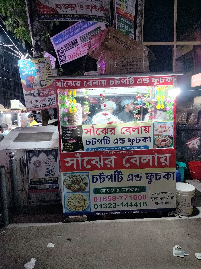 food stall in Charfasson Sadar, Bangladesh. The stall is a brightly colored, red and white, street-side cart that advertises "Sodeb's Delicious Fried and Noodles." The stall has a window with a few people inside preparing the food. There is a man standing outside the window looking at the camera, wearing a white shirt and a white cap, as if waiting for customers. On the wall next to the stall, there are two posters: one advertising "Sodeb's" and another advertising "Kolav Bite." The posters are covered in some places with other signs, including one in English for "polyester." Behind the stall, a building with a red awning is partially visible. To the right of the food stall, there are two buckets: one white and one red. The ground is gray, and the street is mostly dark and empty. The image was taken in the evening, and the street is lit by streetlights. The lighting conditions are dim, with shadows cast around the food stall.