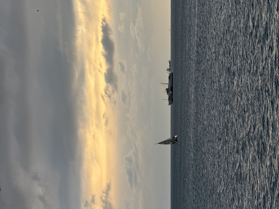 The image displays a seascape at twilight or dawn, viewed from Kadıköy, Turkey, likely facing the Marmara Sea or the entrance to the Bosphorus Strait. The sky occupies the upper third of the frame, characterized by a prominent horizontal band of golden-orange light along the horizon. This bright band is bordered by a mass of dark grey clouds above and lighter grey clouds directly below. Multiple small, dark bird silhouettes are visible against the upper cloud layer. The water, a dark blue-grey, covers the lower two-thirds of the image and exhibits a uniformly rippled surface. In the midground, towards the left, a small sailboat is present, featuring a multicolored sail primarily displaying green and white patterns, with hints of other hues. A single individual is discernible operating the sailboat. To the right of the sailboat, in the mid-distance, a large, traditional passenger ferry with multiple decks and funnels is observed. Further in the background, towards the right, two larger cargo or tanker ships appear as dark silhouettes on the distant horizon. The overall scene depicts maritime traffic under a dynamic sky.