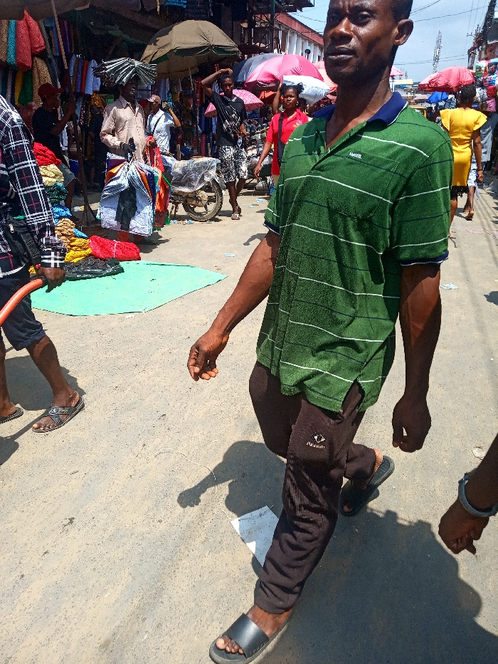 The scene depicts a bustling outdoor market street in Fegge, Nigeria, under direct sunlight. In the foreground, an adult male with dark skin walks towards the viewer's right, looking forward. He wears a short-sleeved green polo shirt with white horizontal stripes and a navy blue collar, dark brown trousers featuring a white "Academy" logo on the left thigh, and black slide sandals. His right arm is slightly bent, and his left arm is extended downwards. To his left, the lower torso and legs of another individual are partially visible, wearing a plaid long-sleeved shirt, dark shorts, and open-toed sandals, holding an orange hose. The midground and background reveal a crowded market environment on a paved surface. Numerous pedestrians are present and in motion. A man in the midground carries a large bundle of striped fabric on his head and additional fabrics in his hands. Another individual in a red shirt carries an item on their head. Market stalls displaying textiles and various goods line the street, partially shaded by an open olive-green umbrella and a pink/red umbrella. A motorcycle, partially obscured and possibly covered, is parked. Colorful fabrics are spread on the ground, some resting on a light green mat. Distinct shadows are cast on the ground from people and structures, indicating direct overhead sunlight.
