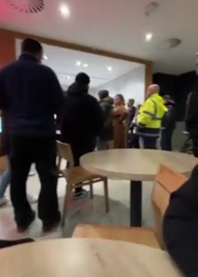 group of about 10 people clustered near a wall, possibly an entrance, in a brightly lit interior space with light-colored walls and flooring. A man in a bright yellow safety vest stands at the edge of the group. Several round tables with wooden chairs are scattered in the foreground. A piece of paper sits on one of the tables. To the left, a wall sign with the words "ger ood" is partially visible. The individuals appear to be stationary, possibly waiting or engaged in conversation.