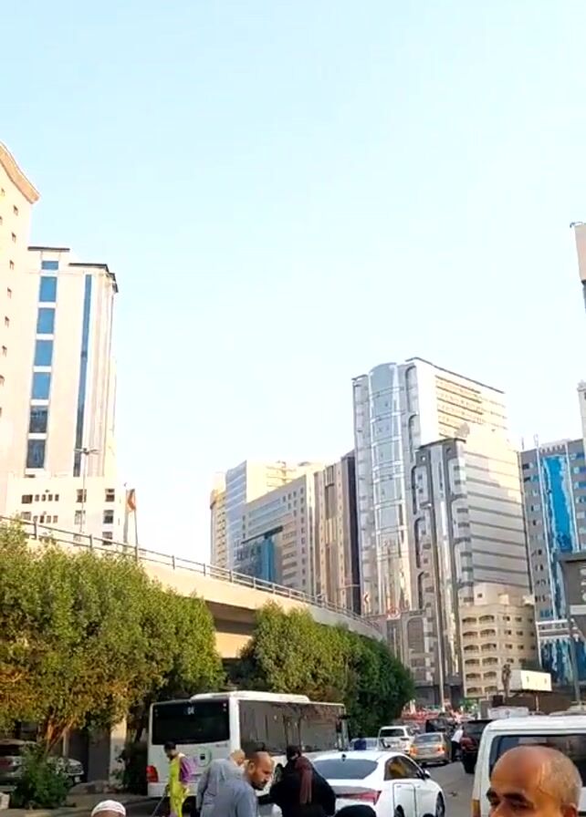 street scene in a city with tall buildings. Several people are present, some of whom appear to be selling items on mats spread on the ground. One man is standing with a wheelchair that has items displayed on it. Other people are walking around or looking at the goods. Cars, buses, and trucks are visible in the background. The buildings are tall and modern, with many windows, and an elevated roadway is visible in the background. The sky is clear and blue.