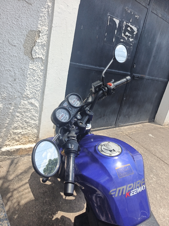 This image, taken in San Carlos, Venezuela, depicts a stationary blue motorcycle parked outdoors under direct sunlight. The motorcycle, identified as an Empire Keeway by the branding on its metallic blue fuel tank, is angled towards the right side of the frame. Visible components include the black handlebars, grips, a dual-gauge instrument cluster, a silver fuel cap, and both circular rearview mirrors. The left mirror reflects a clear sky and green tree canopy. The right mirror faces the background. The immediate background on the left features a textured, off-white wall exhibiting a patch of peeling paint, separated by a vertical white trim. The dominant background element directly behind the motorcycle is a dark, weathered metal gate or large door, displaying multiple areas of chipped paint and remnants of adhesive or torn paper. The ground consists of concrete pavement, marked by sharp shadows indicating intense direct sunlight. No human figures are present.