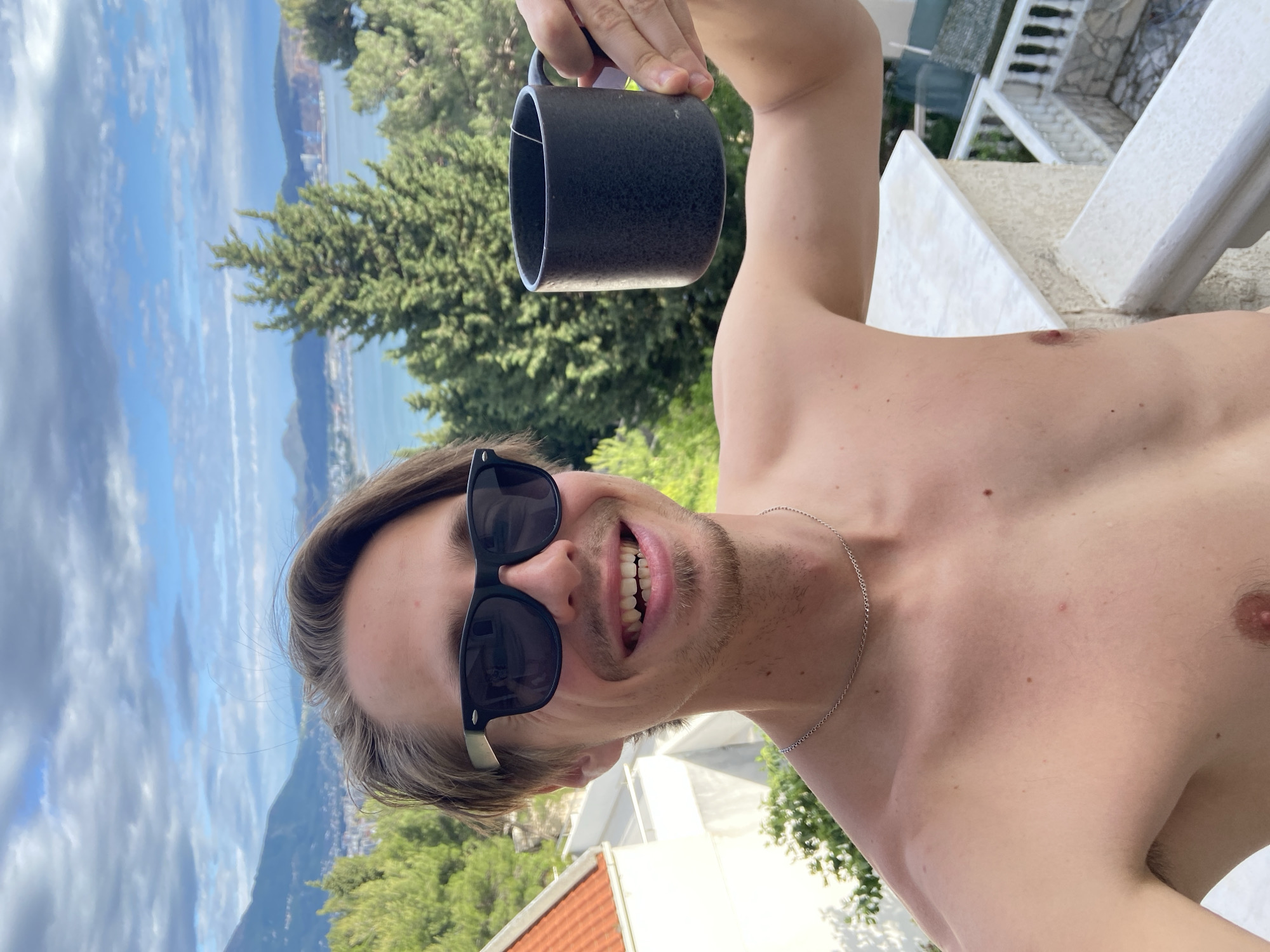 A selfie captured in Šušanj, Montenegro features a shirtless man wearing sunglasses and a silver chain, holding a black mug aloft
