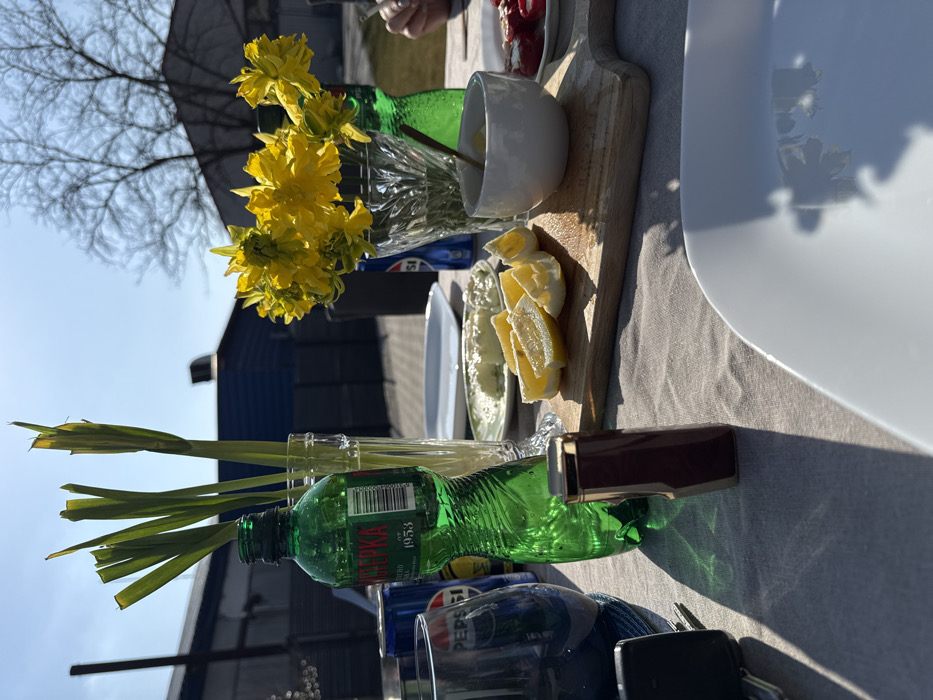 The scene depicts an outdoor dining table in Stara Zagora, Bulgaria, set on a bright, sunny day. The table is covered with a light-colored tablecloth, possibly beige or light grey. In the immediate foreground, a white square plate is positioned, empty. To its left, a dark brown lighter with gold-colored accents stands upright. Adjacent to the lighter, a dark blue or purple-tinted drinking glass is visible, with a black rectangular device partially obscured beside it. A green plastic bottle with a label displaying "ПЕРЕКЛА 1953" in Cyrillic is centrally placed. Behind this, a clear glass contains several long, green stalks, consistent with spring onion greens or similar plants. To the right of the green bottle, a small wooden cutting board holds several quartered lemon wedges. Next to the lemons, a white ceramic bowl contains a yellow substance, with a spoon partially submerged. A plate containing red items, resembling sliced tomatoes or radish, is partially visible further right. Behind the lemon board, a light green plate holds a white, crumbly substance. A clear, faceted glass vase containing a bouquet of yellow flowers, likely daffodils, is also present on the table. A blue Pepsi can is visible behind the green bottle and yellow flowers, and another green plastic bottle is partially obscured. A human hand, displaying a ring on one finger, is visible on the far right edge of the frame, suggesting a person is interacting with the table setting. The background shows an outdoor patio or yard environment. Dark-colored fence panels or walls are visible beyond the table. Further back, several buildings are present, including a structure with dark blue siding and a sloped roof. A deciduous tree with bare branches stands against a clear, brilliant blue sky, indicating an early spring or late winter day. Strong shadows are cast across the tablecloth and objects, consistent with direct sunlight from a high angle.
