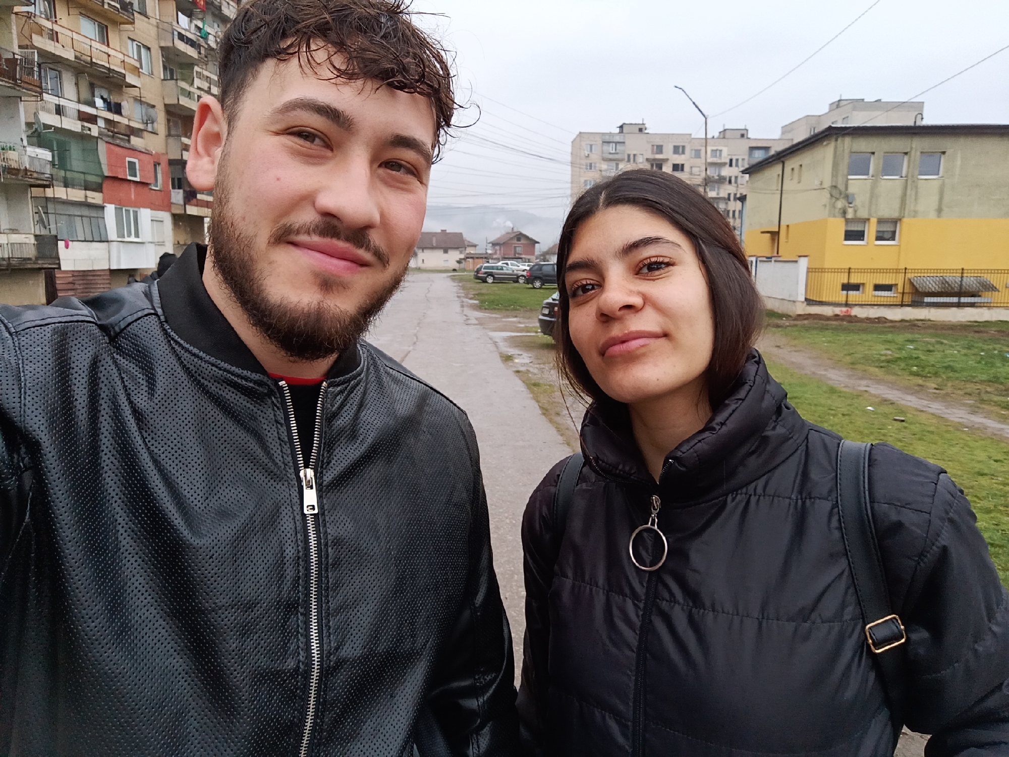 The image depicts two individuals, a male and a female, posing for a selfie outdoors in Roman, Bulgaria, under an overcast sky. The male, positioned on the left, has dark, curly hair and a beard, wearing a black perforated leather jacket over a red garment. He is smiling faintly, looking directly at the camera. The female, on the right, has dark, straight hair and is wearing a black puffer jacket with a silver O-ring zipper pull and a black strap of a backpack visible on her right shoulder. She is also looking directly at the camera with a neutral expression. Behind them, a narrow, grey, likely paved or asphalt path recedes into the background, flanked by overgrown grassy areas. To the immediate left, a multi-story apartment building with numerous balconies, some enclosed, some featuring laundry, appears worn with varied facade colors. In the mid-ground, a cluster of parked cars is visible on the right side of the path. Further back, on the right, a two-story building with a light olive-green upper section and a bright yellow lower section, fronted by a black metal fence, stands behind a grassy area. Beyond this, additional multi-story concrete buildings are visible. In the distant background, hazy hills or mountains are discernible under the grey sky, with some smaller residential structures and a faint wisp of smoke or steam rising from one. Overhead, multiple power lines traverse the scene, and a street light pole is visible on the right.