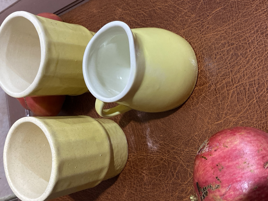 Three yellow ceramic cups and a pomegranate sit on a textured brown surface