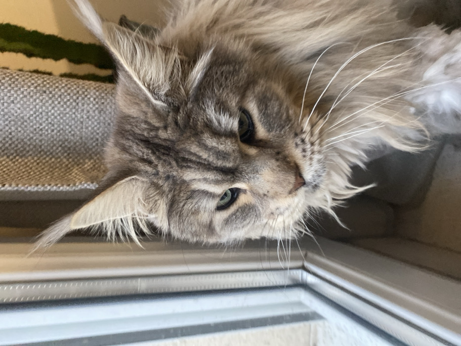 This image, taken in Les Molières, France, depicts an adult Maine Coon cat in an indoor setting