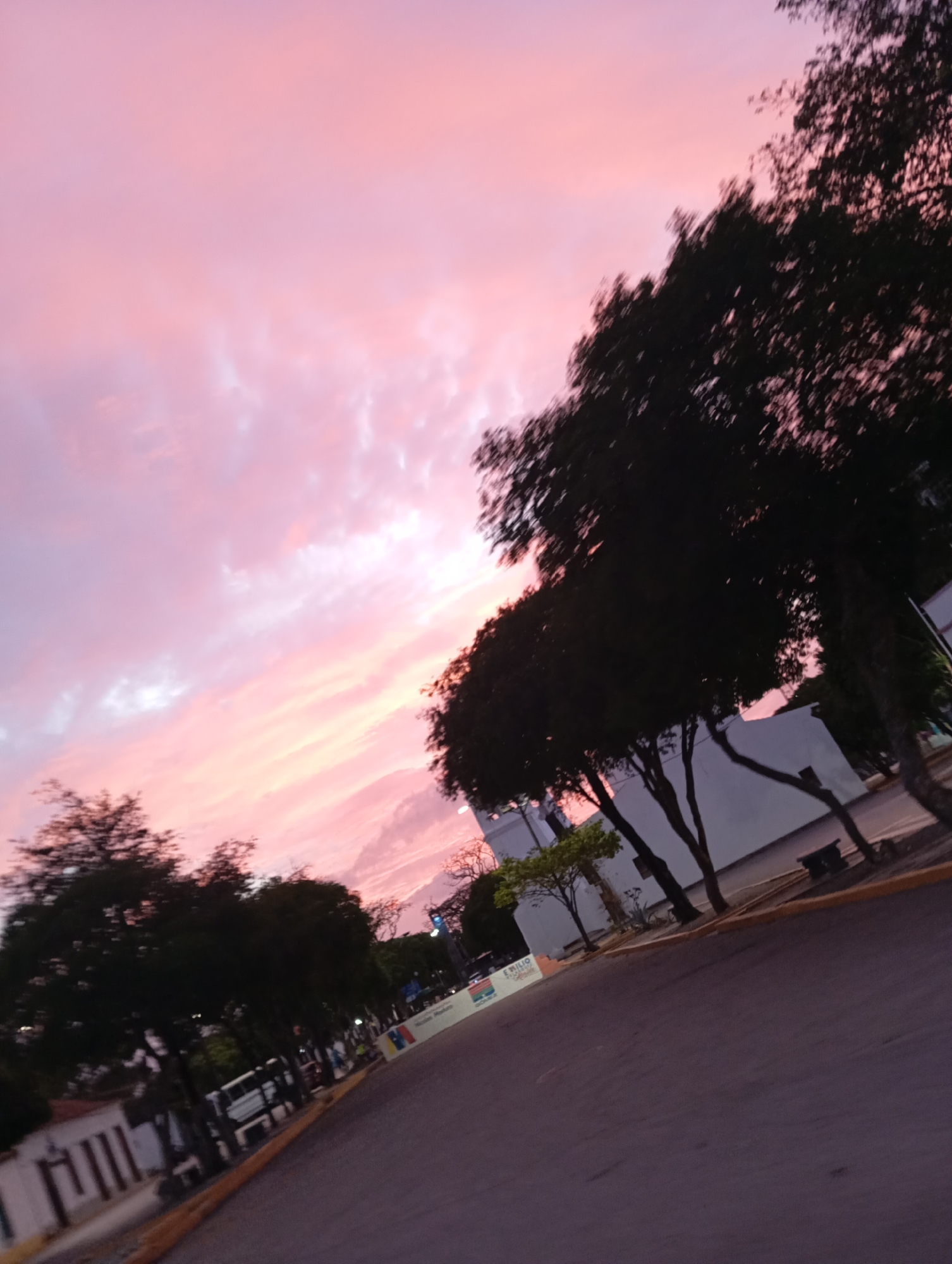 The image captures a street scene at dusk in Tacarigua, Venezuela. The sky is predominantly pink with cloud formations, suggesting a sunset or sunrise. Silhouetted trees line the right side of the street, and a white building with benches is visible behind them. The asphalt street occupies the lower portion of the image. A white banner runs along the street, with faint text indicating "Emilio" and "Tacarigua". A few vehicles and buildings are faintly visible in the distance. The photograph is taken at an angle, indicating a handheld shot.
