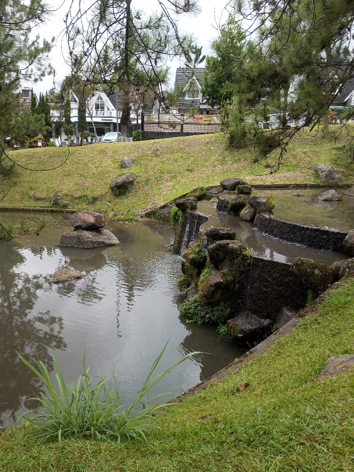 A tranquil scene features a pond with dark water reflecting the overcast sky. Stones and moss-covered rock formations create a small waterfall-like structure within the pond. Grassy banks border the water, with tufts of greenery emerging from the edge. Beyond the pond, a grassy slope leads up to houses with distinctive rooflines partially obscured by trees. A car is visible parked near the houses in the distance.