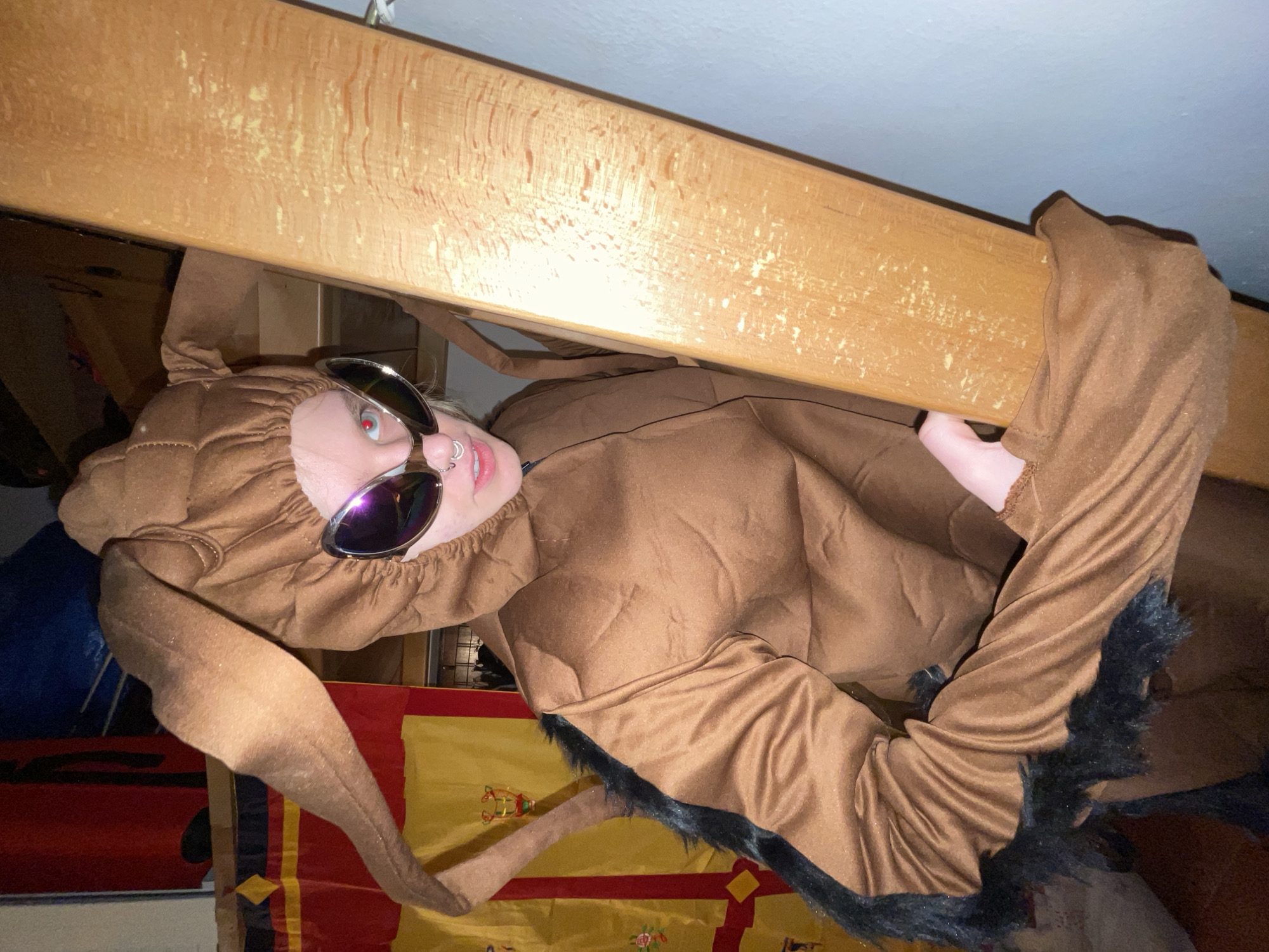 One individual is depicted indoors, in what appears to be a residential or storage area in Budva, Montenegro, facing the camera directly. The person has fair skin, light hair visible around the face, and is wearing a brown, full-body costume consistent with an insect or fantasy creature. The costume includes a hooded headpiece with two elongated, ear-like or antennae-like appendages extending upwards and backwards. Black, shaggy faux-fur material trims the sides of the costume's body. The individual wears large, reflective, wraparound sunglasses with purple-tinted lenses, obscuring their eyes, although a red flash is apparent in the right lens, indicating direct flash photography. A septum ring and a left nostril piercing are visible. The individual's mouth is slightly open. Their right hand is gripping or resting against a vertical light-colored wooden beam positioned along the right side of the frame, partially obscuring the costume. The beam exhibits visible wood grain and lighter, possibly worn, patches. The background on the left features a patterned fabric, predominantly yellow and red, with black details and embroidered or printed motifs. The wall on the right side of the frame is a plain light blue or gray. The scene is evenly lit by an unseen light source, likely a direct flash.