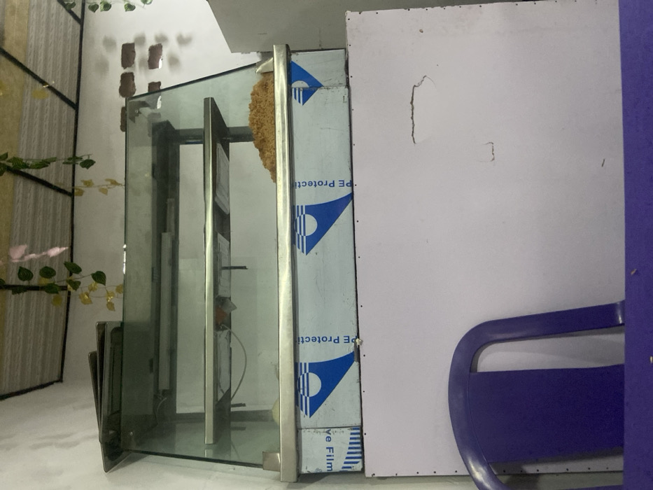 A glass-enclosed display case stands next to a white panel with a blue logo strip. The display case has metal trim, and a sponge-like material is visible at the top. To the right, part of a blue plastic chair is visible. The display case reflects the surroundings, including a faux plant. The panel behind has some minor damage.