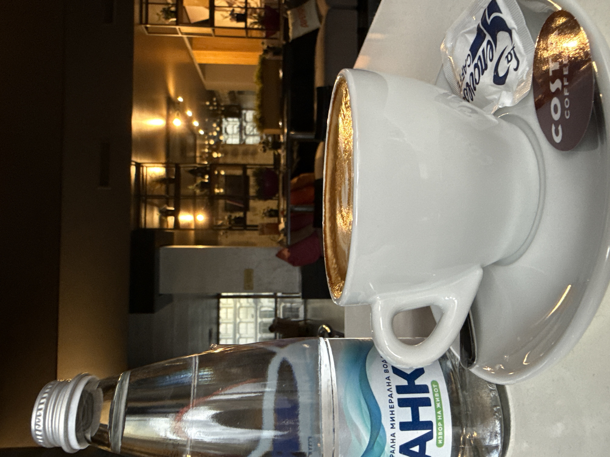 A white ceramic cup containing a foamed coffee beverage rests on a white saucer, positioned on a light-colored table surface. Adjacent to the cup is a La Perruche sugar packet. A maroon-colored Costa Coffee branded oval coaster lies beneath the cup, partially visible. To the left of the coffee setup, a transparent glass bottle of Bankya mineral water, identifiable by its blue and green label with Cyrillic text, stands upright with a silver screw cap. The water level in the bottle is approximately two-thirds full. The scene is set indoors within a dimly lit commercial establishment, likely a cafe or restaurant, located in Shumen, Bulgaria. The background features warm, ambient lighting from multiple ceiling fixtures and lights integrated into dark metal shelving units. These shelves hold various decorative items, including small potted plants. Dark upholstered seating arrangements are visible further back. Through a distant window or glass partition, an exterior building with a gridded facade is discernible, and a single, indistinct human figure appears in the far background, partially obscured. No direct actions or interactions are evident.