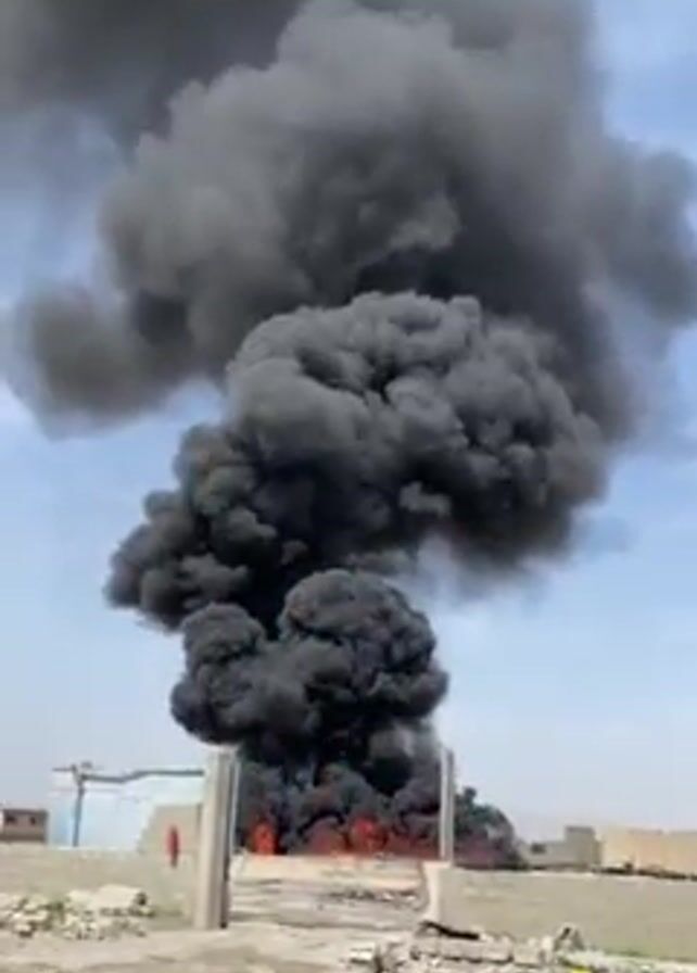 large plume of black smoke rising from a fire in an outdoor area. The fire appears to be contained within a fenced area, with visible flames beneath the smoke. Surrounding the fenced area are various structures, including what appears to be a storage tank and buildings constructed of concrete blocks. Debris and rubble are scattered around the site. The sky is blue, and the overall impression is of a significant fire incident in an industrial or semi-urban environment. A small portion of a person's hair is visible in the lower left corner of the frame, suggesting someone is recording the scene.