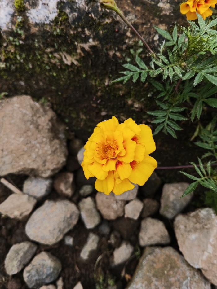 The image displays a close-up, ground-level view of an outdoor scene in the city of Unknown, Vietnam. Central to the frame is a single, fully bloomed marigold flower, predominantly yellow with subtle reddish-orange coloration visible within its innermost petals. This flower is situated amidst an arrangement of numerous irregularly shaped, light brown to grey rocks of varying sizes, interspersed with dark, moist soil. In the upper right quadrant, green foliage, consistent with a marigold plant, is present, alongside a partially visible, blurred yellow-orange flower. The upper background features a dark, textured surface covered with green moss. A thin, brown plant stem with a pale green bud extends from the mid-frame towards the upper left. No individuals or specific actions are depicted.