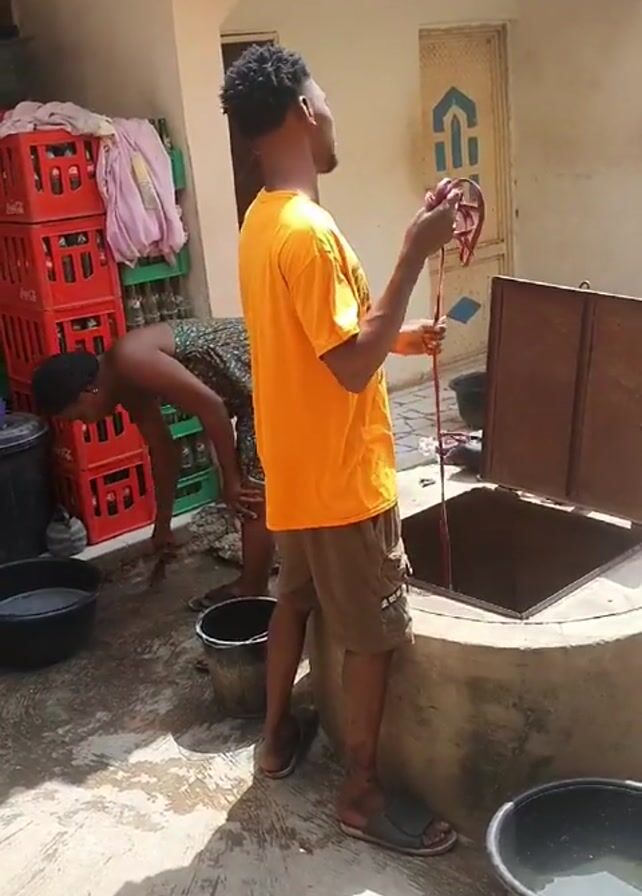 Here's a detailed description of the video: The video shows two young men in an outdoor courtyard area. One man, wearing an orange shirt and brown shorts, stands next to a well. He is holding a red rope and appears to be preparing to draw water from the well. The well is circular and has a square metal lid open on one side. Several large basins and buckets are placed nearby. The other man, shirtless, is seen near a stack of red and green Coca-Cola crates. He is using a tool (possibly a brush or stick) near one of the basins, seemingly cleaning the area. The setting is a concrete courtyard, possibly the exterior of a house or building, as indicated by the painted door visible in the background. Sunlight is present, creating shadows on the ground. The overall scene suggests a daily activity related to drawing water from the well, perhaps for cleaning or other household purposes.