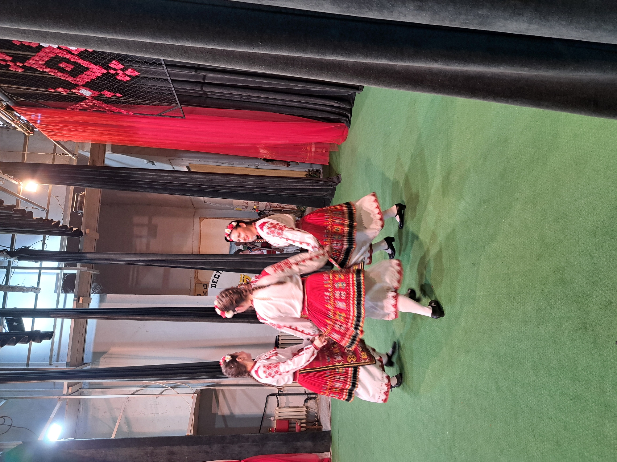 Three girls are performing a traditional Bulgarian folk dance on a green stage