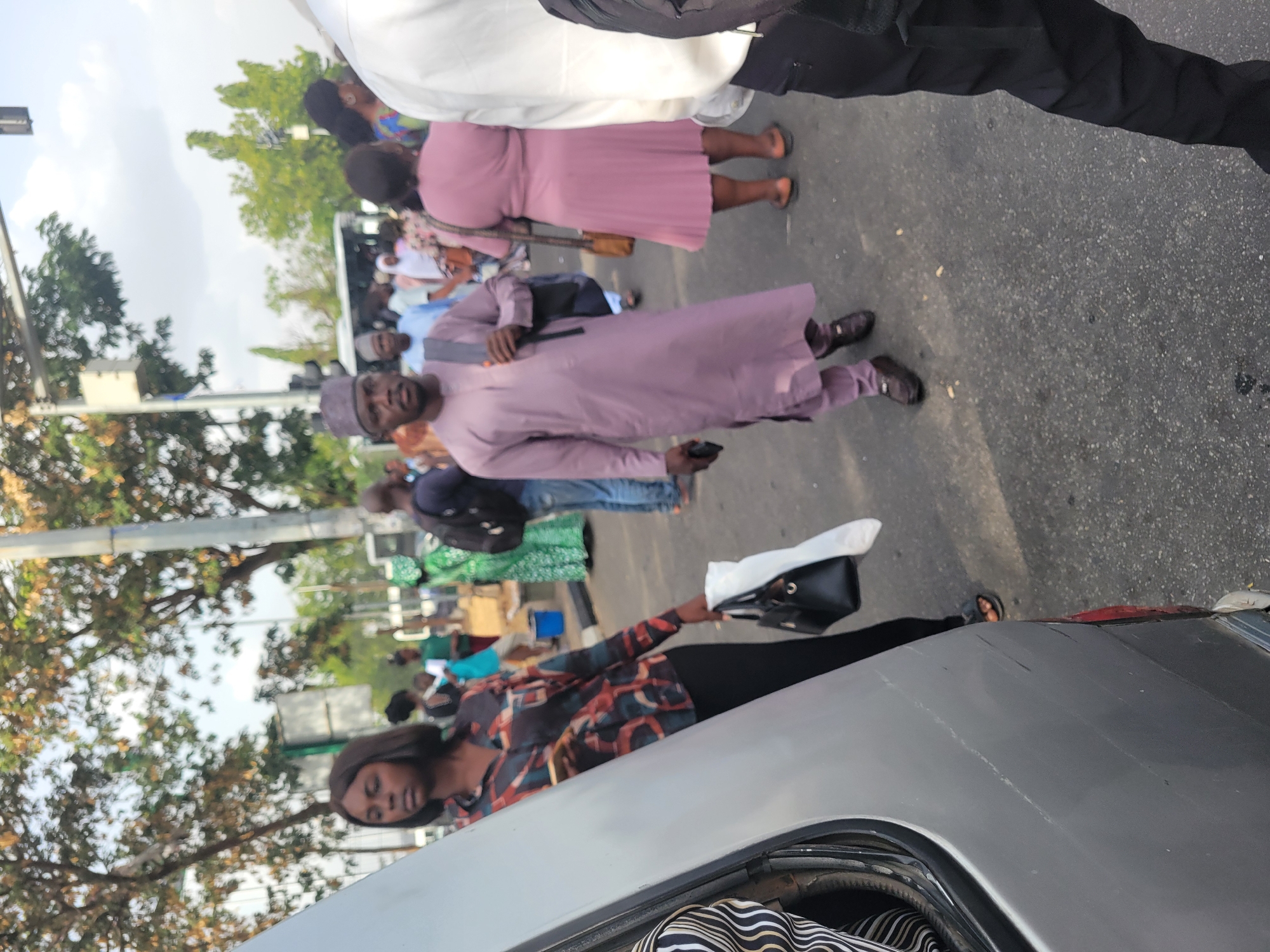 The photograph shows a group of people on a street in Abuja, Nigeria