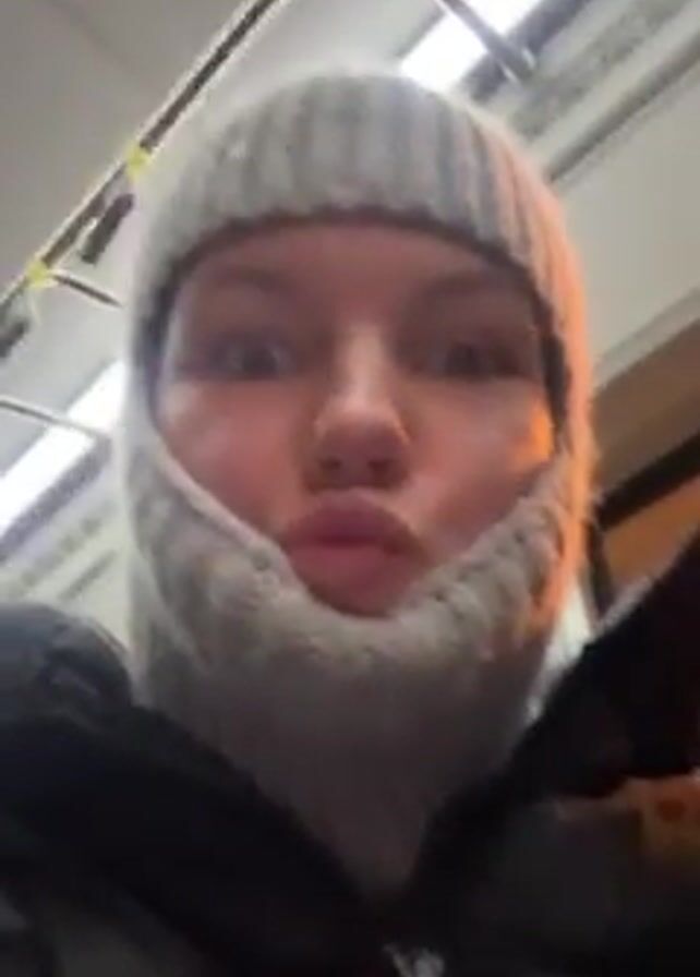 person wearing a gray knit balaclava and a black winter jacket in what appears to be public transportation
