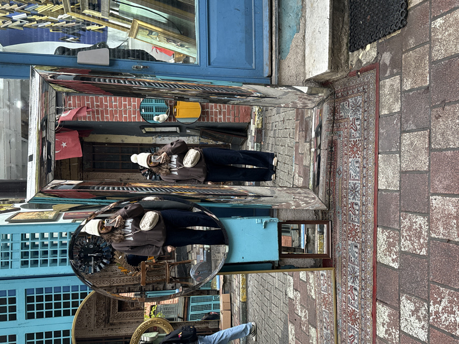 The image depicts an outdoor scene on a paved street in Istanbul, Turkey, consistent with the aesthetic of antique districts such as Çukurcuma or Balat. A central female individual is captured in multiple reflections within an elaborate display of mirrors. She wears a cream-colored beanie, sunglasses, a dark brown hooded sweatshirt with a white graphic, dark blue wide-leg pants, and light-colored flat shoes, carrying a quilted cream crossbody bag. Her action is holding a smartphone in her right hand, ostensibly taking a photograph or selfie. The primary reflective surface is a large, rectangular, ornate mirror standing vertically on the street, framed with what appears to be a distressed metallic finish. To its left, a large oval mirror is mounted on a teal-colored utility box. The street surface consists of a mix of reddish-brown and grey block pavers, partially overlaid by decorative, red-patterned carpets. The surrounding environment includes architectural elements: a bright blue wooden door and window frame are visible to the left, and a blue entrance with a white stone step is on the right. In the reflections, a brick wall, a brown wooden door, and a Turkish flag (red with a white star and crescent) are discernible. Additional objects visible through reflections include antique wooden chairs, various picture frames, and other mirrors, suggesting an antique or mirror shop. The lower legs of a second individual, wearing blue jeans and black-and-white Adidas sneakers, are partially visible on the far left.