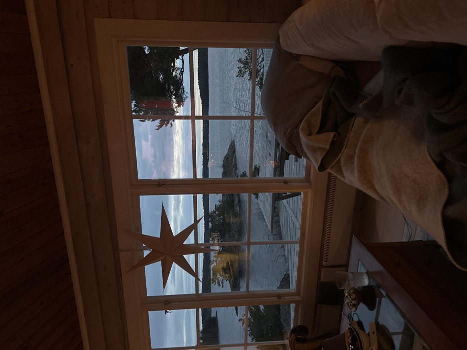 The image presents an indoor scene looking out through a multi-paned window towards a large body of water in Boda, Sweden, during twilight