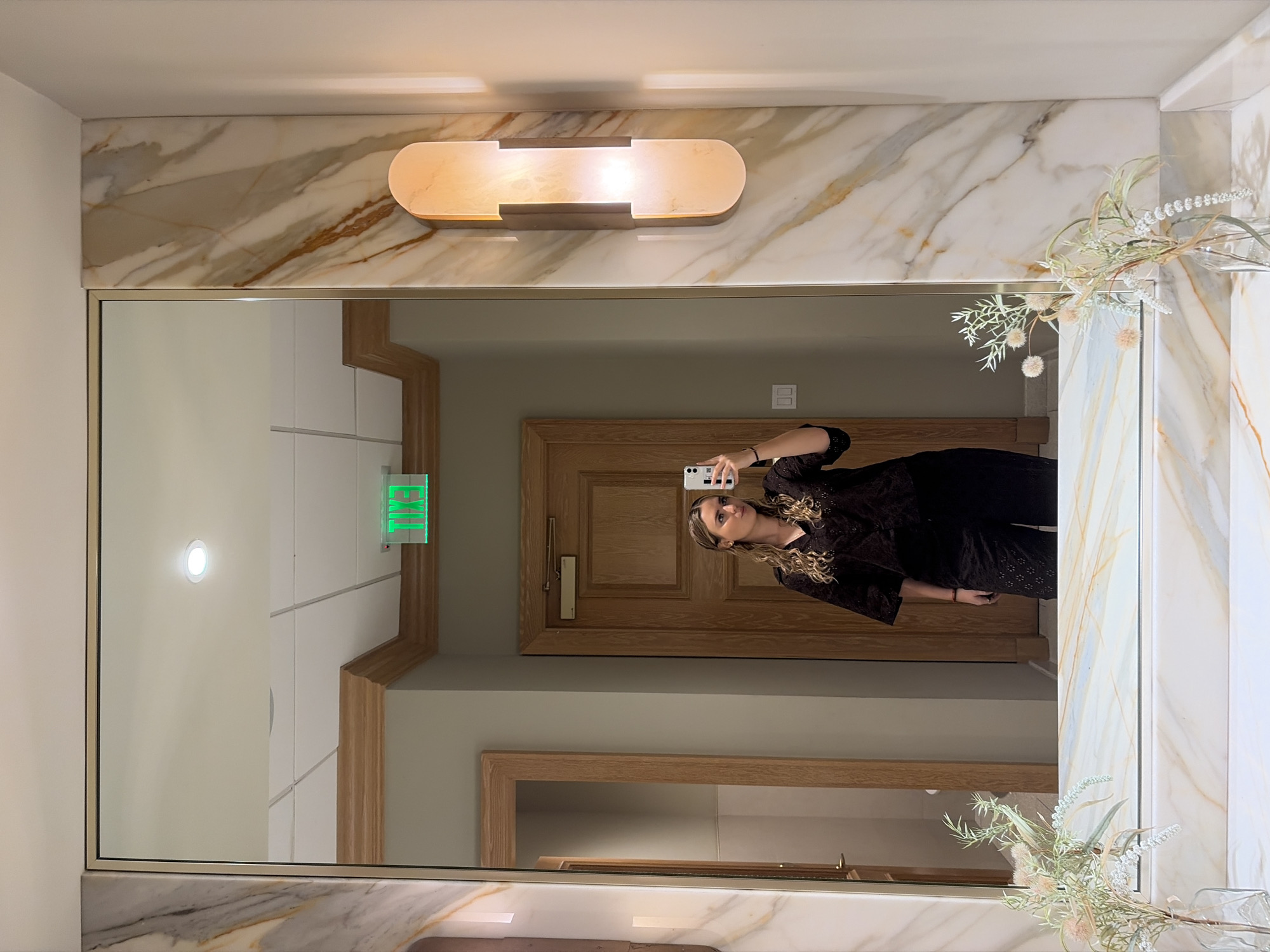 A woman takes a mirror selfie in what appears to be a restroom. The scene shows a large, rectangular mirror framed by a material that resembles marble with tan and white veining. Above the mirror is an elongated oval light fixture. The mirror reflects the interior of the restroom, which includes a door and an "EXIT" sign with green letters, indicating a public building. The restroom seems to have a neutral color palette. The location is in Key Biscayne, United States of America.