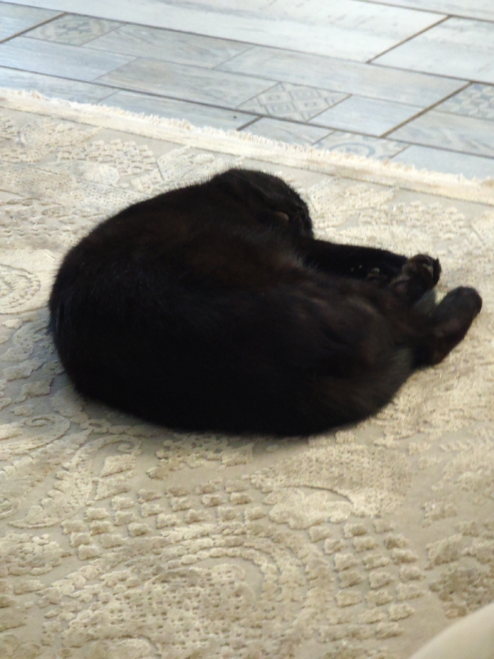 - "A black domestic cat is observed curled tightly in a resting or sleeping position on a light beige rug featuring an embossed, ornamental pattern" by FM-jysRZ2, licensed under CC BY 4.0